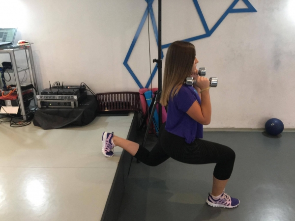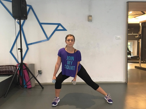 Izvođenje vježbe, bugarski čučanj. Stanite ispred klupe leđima okrenuti klupi, postavite vrh stopala jedne noge na klupu i blago je savijte u zglobu koljena, noga koja je na tlu je potpuno opružena. Gornji dio tijela je uspravan (tokom cijele vježbe). Savijajući se u zglobu kuka i koljena noge na kojoj stojite spuštite se dolje dok koljenom druge noge skoro ne dodirnete tlo. Vratite se u početni položaj ispružajući u zglobu kuka i koljena noge sa stopalom na tlu. Visinu klupe prilagodite sopstvenoj visini (visina klupe bi trebala da bude malo manja od visine koljena). Uzmite bučice u ruke i držite ih u visini ramena.
