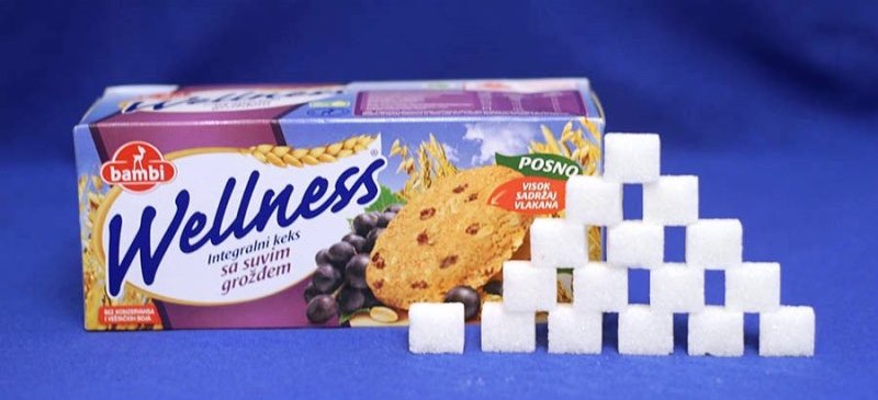 Rijetko obraćamo pozornost na taj dio deklaracije i usredotočeni smo na količinu vitamina ili proteina koja se nameće na ambalaži, pa ovim člankom želimo skrenuti pozornost koliko kockica šećera sadrže, uzet ćemo da je kockica šećera = 2,5 grama.