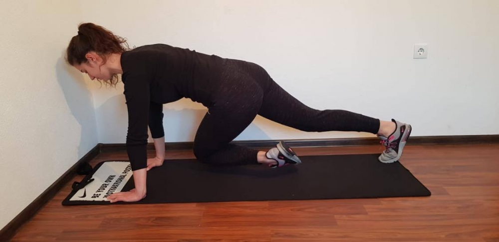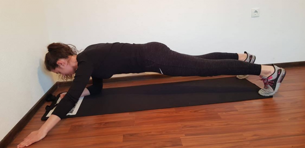 - Počni u poziciji hovera i obrati pažnju da ti laktovi budu tačno ispod ramena, podlaktice na podu, kukovi u visini ramena i stopala šire od širine kukova.