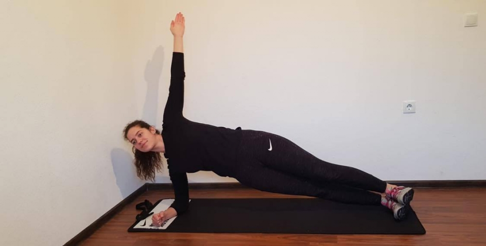 - Započni vježbu u bočnom položaju, sa ramenima iznad lakta koji je na podu, podigni kukove tako da tijelo bude jedna prava linija, spoji stopala i stegni zadnjicu da kukovi budu u liniji sa ramenima i stopalima.