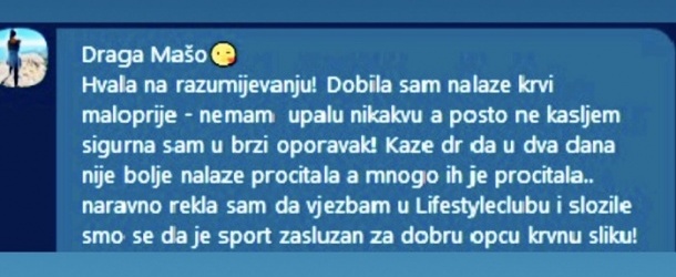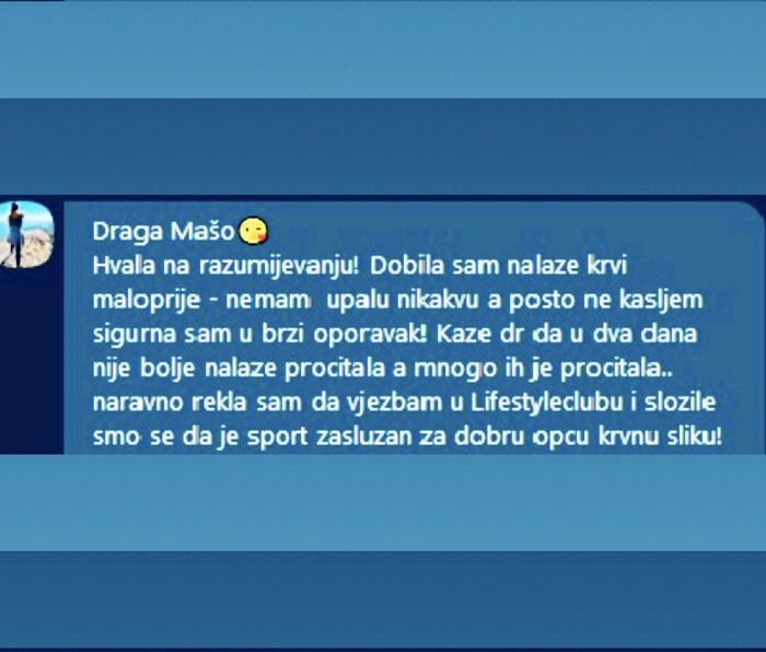 Neki dan jedna naša članica rekla je da je bila kod njene doktorice koja se nakon pregleda njenog nalaza začudila u pozitivnom smislu i potvrdila činjenicu da dolazak u fitness i redovna fizička aktivnost je zaslužna za opšte zdravlje i pomaže imunološkom sistemu da ojača.