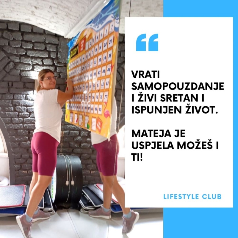 "Krenula sam sa vježbanjem u Lifestyle clubu kada mi je bilo najgore u životu. Imala sam oko 86 kg, 0% samopouzdanja i kondicije. Krenula sam sa svojom pričom 3. maja 2023. i ona i dalje traje. Sada imam -22 kg, 100% samopouzdanja i kondicije. Ne planiram prestajati mijenjati svoj život i izgled. Znala sam da će dolazak u Lifestyle club promijeniti moj život iz korijena i definitivno je to najbolja odluka koju sam donijela❤️" - Mateja