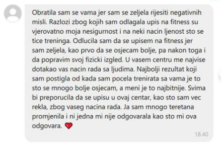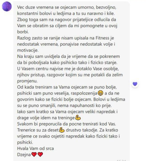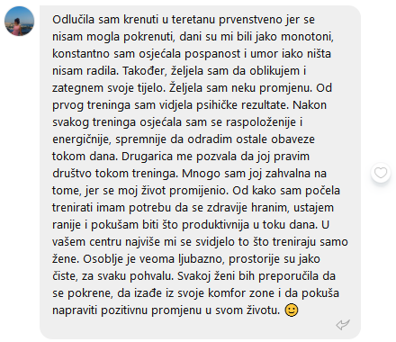 2. Jedan trening je s privatnom trenericom, koja će, obzirom na tvoju trenutnu situaciju, izraditi najbolji program za reaktivaciju baš za tebe.