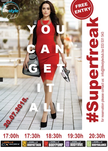 Ako ste uvijek raspoložene, samouvjerene i pomalo divlje, i ne možete zamisliti život bez treninga vi ste prava Super Freak djevojka koja ne smije propustiti novu promociju Lifestyle Cluba!Osjetite snagu, energiju, pozitivne vibracije kada dodjete u klub i kada se vratite kući poslije odrađenog treninga.Za superfreak djevojku ništa nije nemoguće dok hoda vrelim ljetnim ulicama u svojoj omiljenoj haljinu sa ruksakom i osmjehom na licu, zaljubljena u fitness sa željom da promijeni svoj život. |